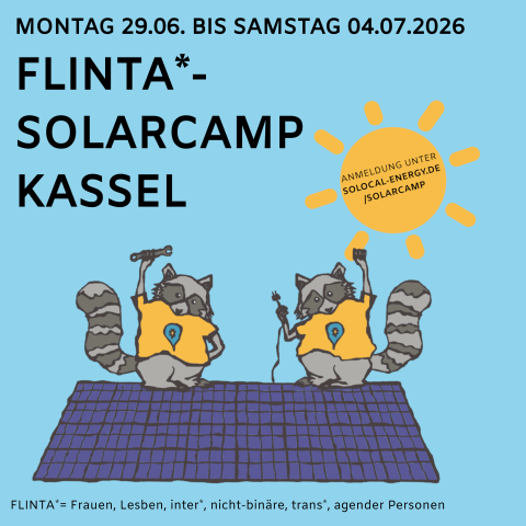 Dieses Jahr organisieren wir wieder ein SolarCamp ausschließlich für Frauen & TINA* (trans*, inter*, nicht-binäre & agender Personen)! Vom 29. Juni bis zum 4. Juli gibt es eine Woche geballtes PV-Wissen in Theorie & Praxis.